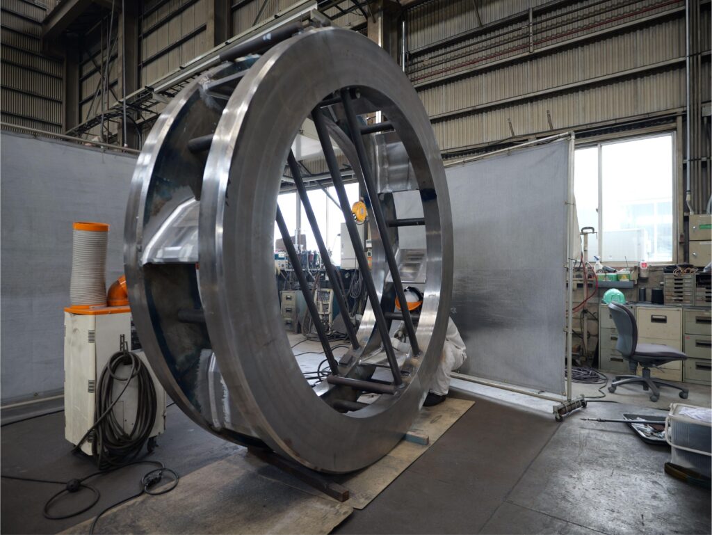 その強みは、技術も知恵も80年続けている会社であることと、お客様の要望や設置場所の環境 (⽔量・落差)に応じた⼀つひとつ異なる⽔⾞の設計・製造を⼀貫して⾏えるところにあります。 現在、⽔を受けて回る⽔⾞のはねの形で⽔のエネルギーをどれだけ効率良く回転エネルギーに変 えられるか。明電舎の協⼒もあってこの解析に⼒を⼊れ、同じ⽔の量でも出⼒が上がることを⽬ 指しています。